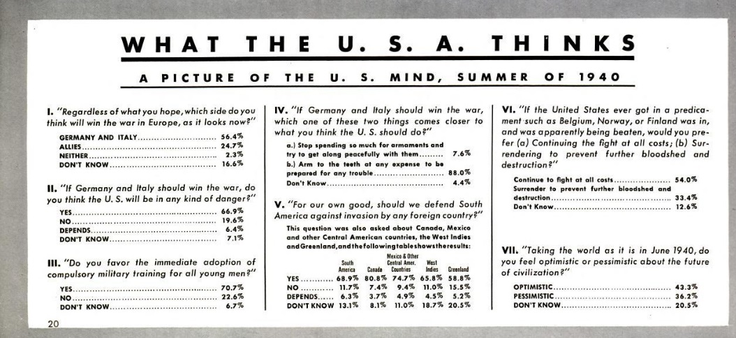Here’s a snapshot of U.S. public opinion after Europe had been at war for almost a year, from the July 29, 1940, issue of Life Magazine. (You can view a larger image by clicking the image above.)