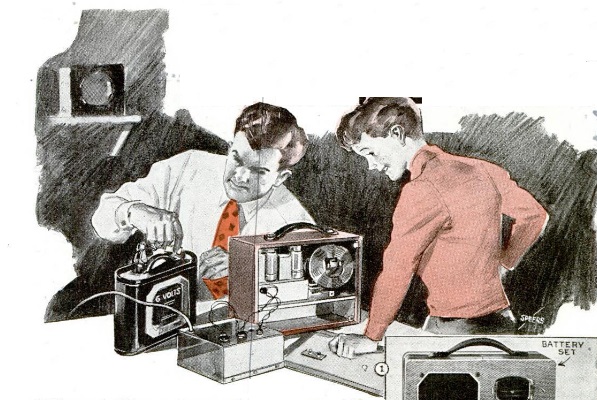 The young man in this picture is now close to 100 years old, but in 1940, you can see the look of pride in his face that his dad figured out how to economize on the cost of B batteries for their portable radio. Generally, such radios required two batteries–one, often 1.5 volts, for the filaments, and another one, usually 45-90 volts for the B+.