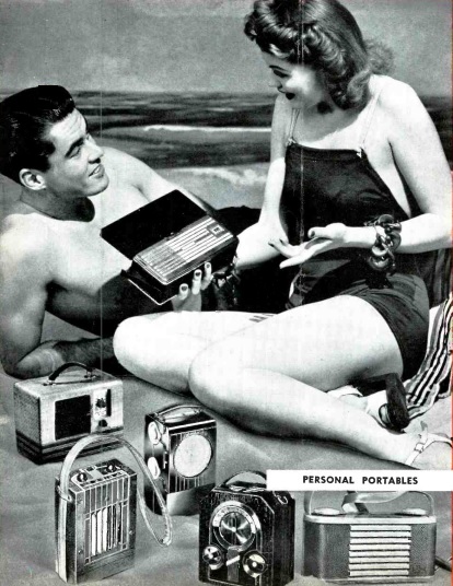 Eighty-five years ago, this couple is relaxing at the beach while they show off some of the latest personable portable radios available on the market. They include models from RCA Victor, Automatic, Emerson, Sonora, Majestic, and Philco. The picture appeared on the cover of Radio Retailing, August 1940.