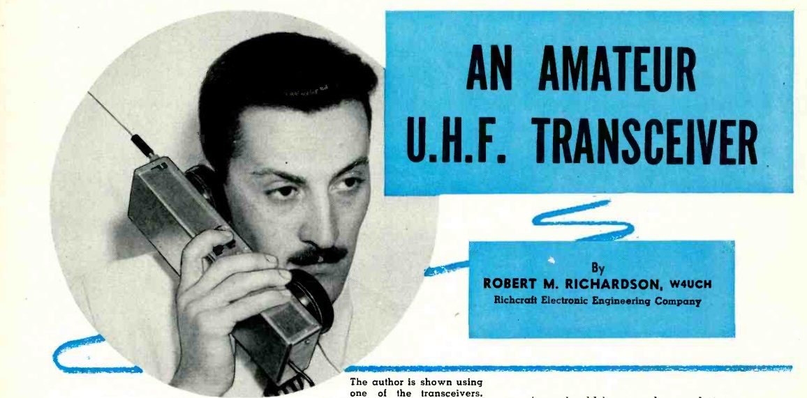 Shown here, in the August 1955 issue of Radio News, is Robert Richardson, W4UCH, operating a 70 cm handheld radio. He noted that there was little activity above 2 meters, and set out to provide an economical way to get on the UHF band. The cost of each transceiver was only $13, meaning that two could be made for about $25. Range was about a mile over favorable terrain, with distances of up to five miles with an outside dipole antenna. The set was billed as ideal for short-range civil defense work.