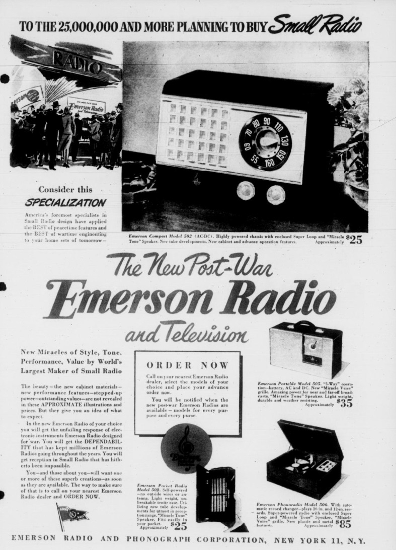 Eighty years ago, production of civilian radios was still banned, but the public and radio manufacturers knew that the end was in sight, and manufacturers were gearing up to meet the pent-up demand. This ad appeared in the Detroit Evening Times, August 26, 1945, and shows what Emerson had planned.