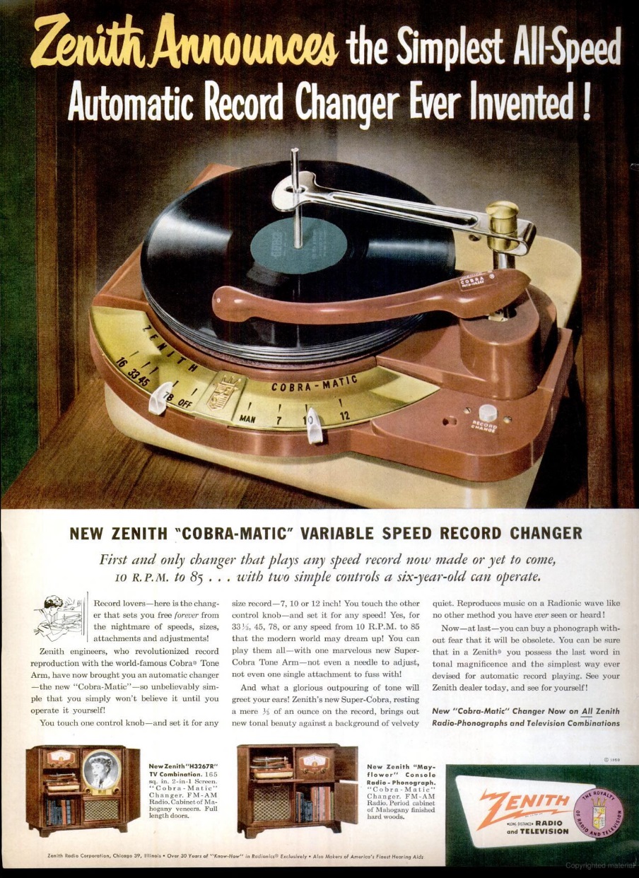 Seventy-five years ago today, the August 28, 1950, issue of Life magazine carried this ad from Zenith announcing the “Cobra-Matic” record changer. A couple of the consoles including it are shown below. “Cobra” is the shape of the tone arm, and “Matic” means that it’s fully automatic.