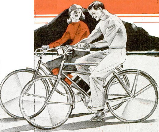 Eighty-five years ago, this couple enjoy a favorite radio program as the pedal the streets and roads, thanks to a three-tube radio that works in practically the same manner as a car radio. Two of the tubes are triple purpose, in addition to the power tube feeding the 4-inch speaker. The set came with antenna, mounting hardware, and the battery, which can be seen on the frame.