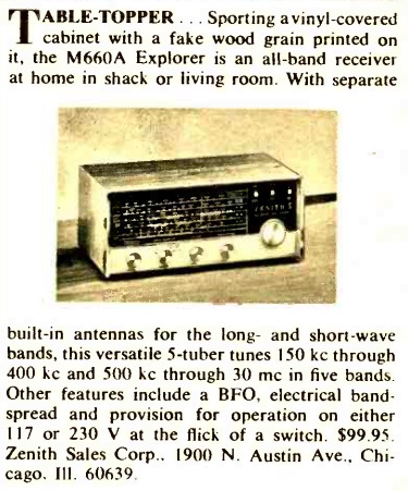 Sixty years ago this month, the November 1965 issue of Electronics Illustrated introduced the Zenith Model M660A “Explorer” receiver.  It covered longwave, the standard AM band, and shortwave, and included a BFO.  The picture here doesn’t really do it credit, but the handsome set really would have been in place in the living room.