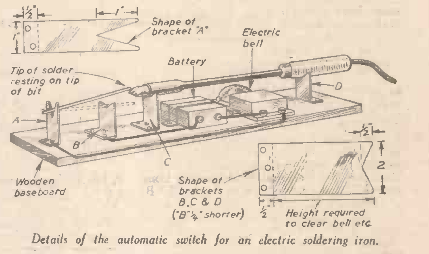 This helpful hint appeared 85 years ago in the British Practical Wireless magazine, November 1940. At first, I thought the idea had been sent in by Rube Goldberg, but it was actually one J. F. H. Aspinwall of Wirrall. who sometimes plugged in the soldering iron and forgot about it. His solution solved that problem, and also let him know when the iron was hot enough. He rested a piece of solder between one buzzer contact, with the other end on the iron, perched precariously above the other contact. When the iron was hot enough, the end of solder melted and the piece dropped onto the other contact, completing the circuit and sounding the buzzer.