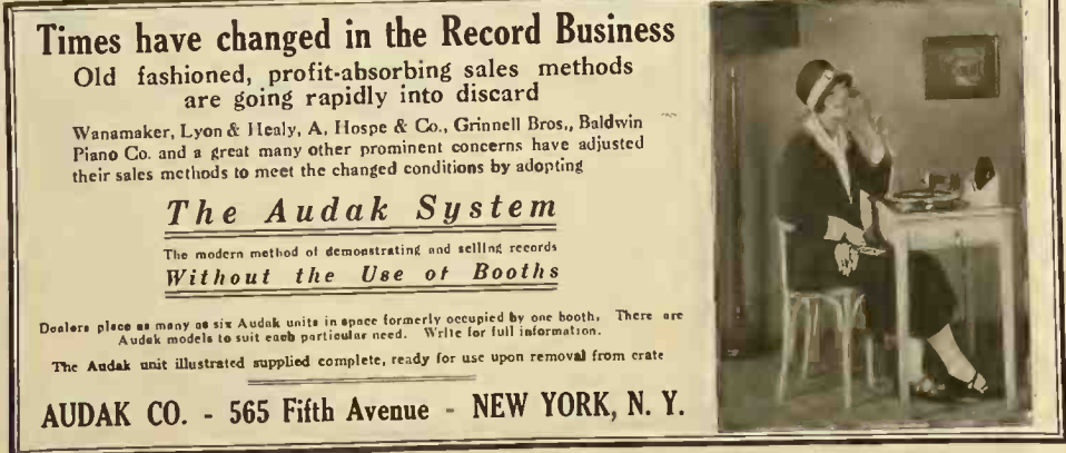 1925One hundred years ago, times had changed in the record business, and the progressive record dealer had abandoned old-fashioned, profit-absorbing methods. Instead, they had adjusted to modern conditions by getting the Audak System, from the Audak Co., 565 Fifth Avenue, New York.
