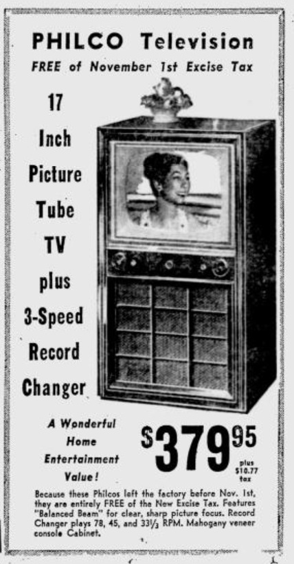 If you were thinking of being an early adopter and getting a television 75 years ago, it might behoove you to act fast, since Congress had just enacted a 10% excise tax.  But if you acted fast, you could get one without the tax, as reminded by this ad in the November 18, 1950, issue of the Pittsburgh Post-Gazette from the Hahn Furniture store.