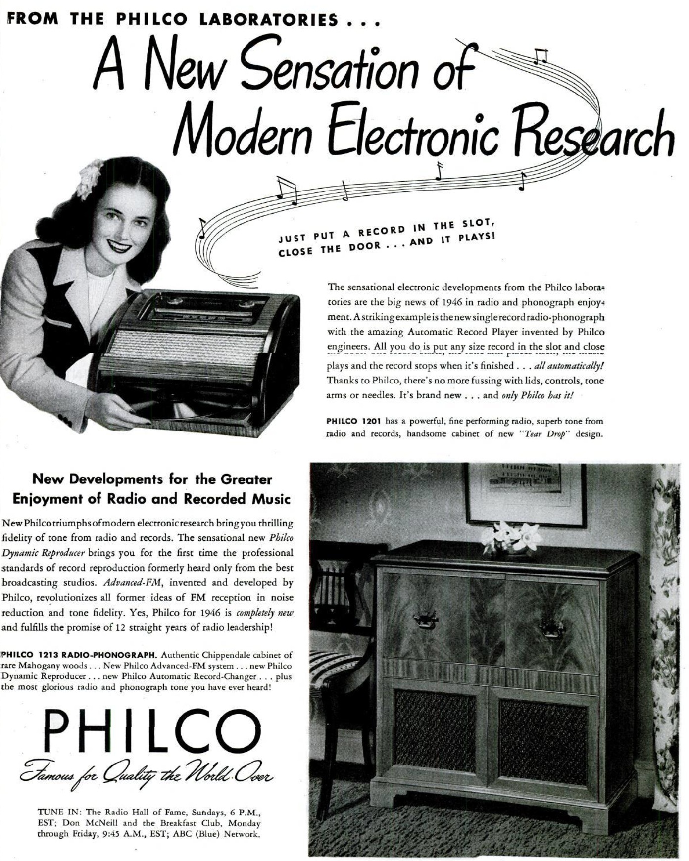 Eighty years ago today, the February 18, 1946, issue of Life magazine carried this ad for two of Philco’s latest offerings. The model 1213 was a console radio-phonograph. The ad mentions that the radio tunes both AM and FM (the new postwar band). But it also covered 9.3 through 14.5 MHz shortwave.