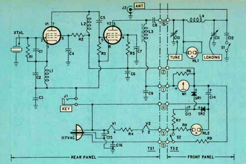 As shown here, the transmitter was constructed with two chasses. The front contained the controls, meter, and tuning indicator. The rear panel was for mounting the tubes and crystal, and for the key and antenna connections.