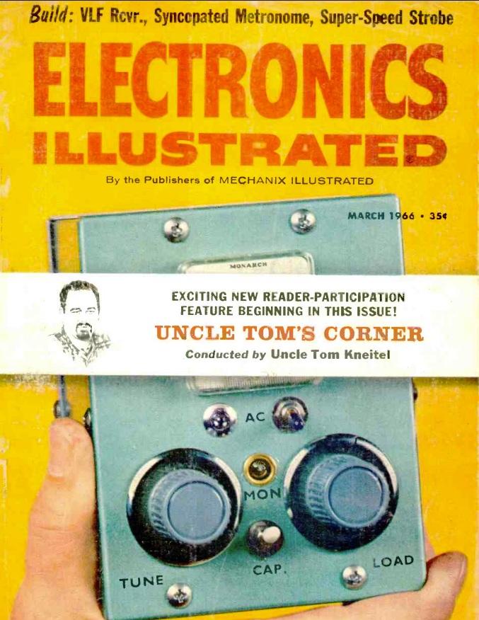 Sixty years ago this month, the cover of the March 1966 issue of Electronics Illustrated featured the “Mini-Mitter,” a compact and lightweight (28.5 oz.) 15 watt transmitter for 40 meters. The construction article, is written by Russ Alexander, W6IEL, whose work we have seen previously. He notes that the radio weighs less than the missing power transformer. No transformer was necessary for two reasons. First, the 50-volt tubes were wired in series (along with a 130 ohm 5 watt resistor) directly to the AC power. And the B+ was courtesy of two solid-state diodes wired as a voltage doubler to produce about 310 volts.