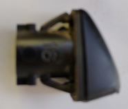 The repair job is very simple. If you examine the new nozzle, or the old nozzle shown at right, you can see that you just need to push a tab, and the whole nozzle then slides out from the top of the hood. You can’t see where the tab is, but it’s an easy matter to find it by pushing a screwdriver into the hole, as shown at left.
