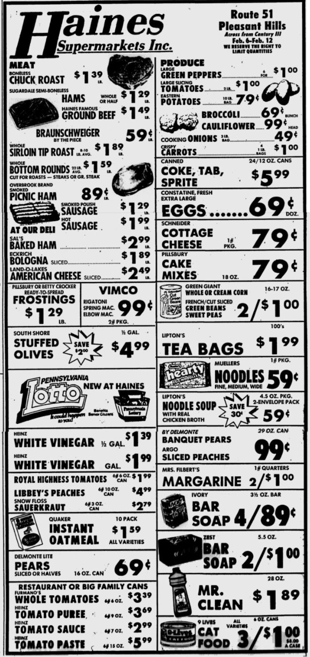 For a snapshot of grocery prices 40 years ago, this ad for Haines Supermarkets appeared in the Pittsburgh Post Gazette on February 6, 1986. According to this inflation calculator, a dollar in 1986 is equivalent to $2.94 in 2026 dollars, so to compare, you need to triple these prices. So eggs for 69 cents are actually the equivalent of about $2 today. Ground beef for $1.49 a pound is almost $4.50 today. And the 50 cent margarine is about $1.50 today.