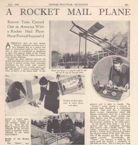 Eighty-five years ago this month, the July 1940 issue of the British magazine Practical Mechanics gave an update on what the Americans were up to: Rocket mail. While the concept never caught on, some postal administrations, including the U.S., were exploring the concept. You can read more about it at Wikipedia.