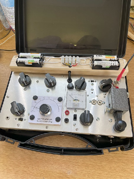 The color photo at the top of this page is not the 1950 version (for that we have only the grainy picture). It is actually the 2025 G3EDM version. There are some modifications. For example, the 2025 version is on 40 meters. Since most of the operating was to be done during the daylight hours, this was a better choice than 80. It also uses modern lithium batteries, which G3EDM was able to charge at night while lodging in hotels along his path.